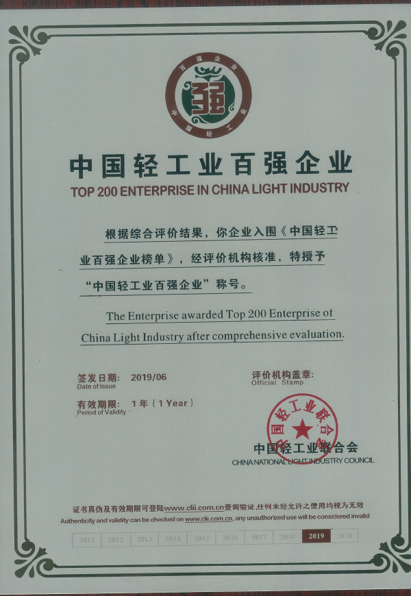 中国轻工业百强企业称号