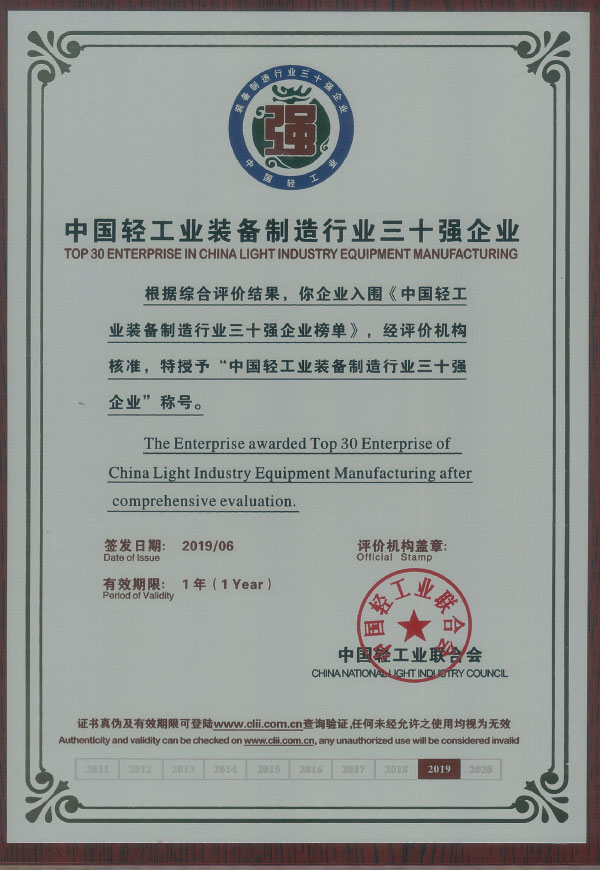 中国轻工业装备制造行业三十强企业称号