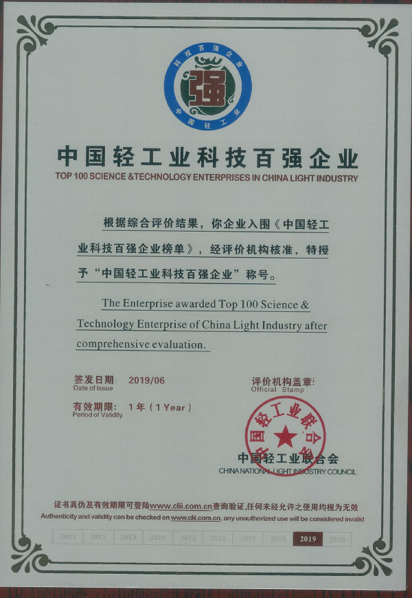 中国轻工业科技百强企业称号